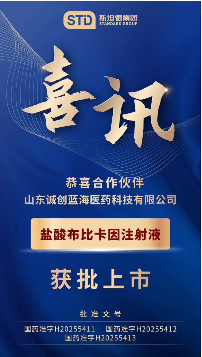 近日,斯坦德生物医药成功助力山东诚创蓝海医药科技有限公司(以下简称“山东诚创蓝海”)申报的盐酸布比卡因注射液获批上市。
